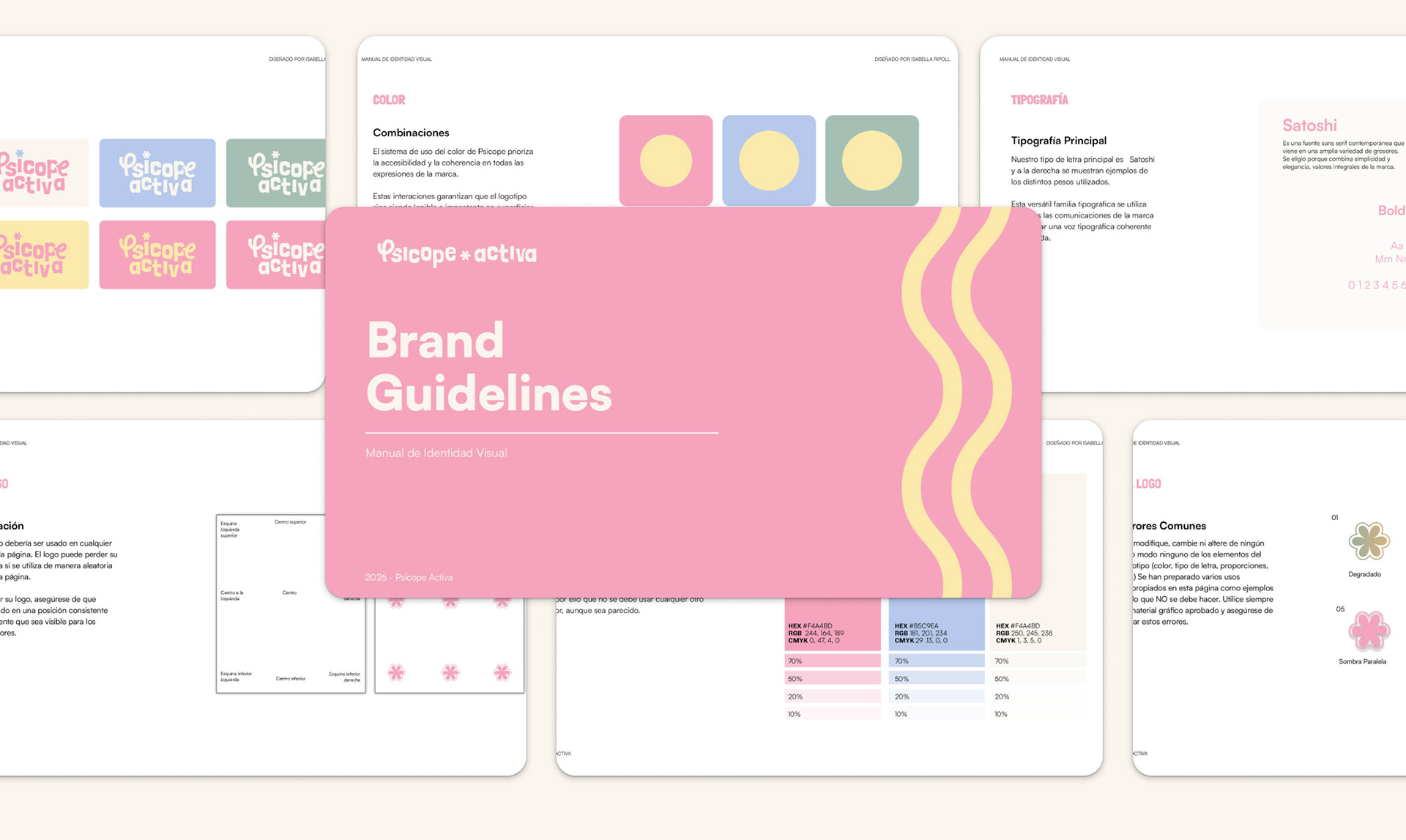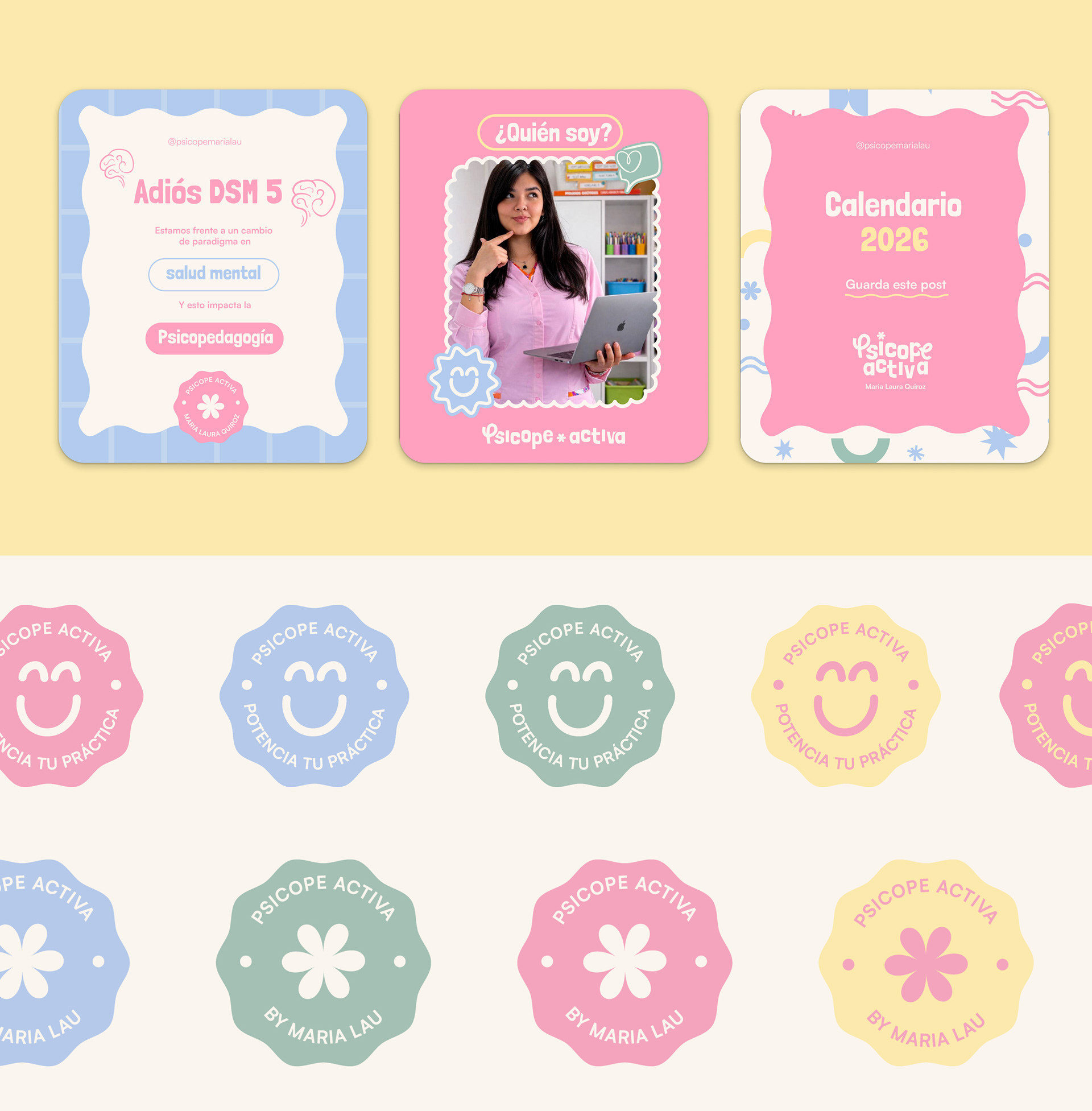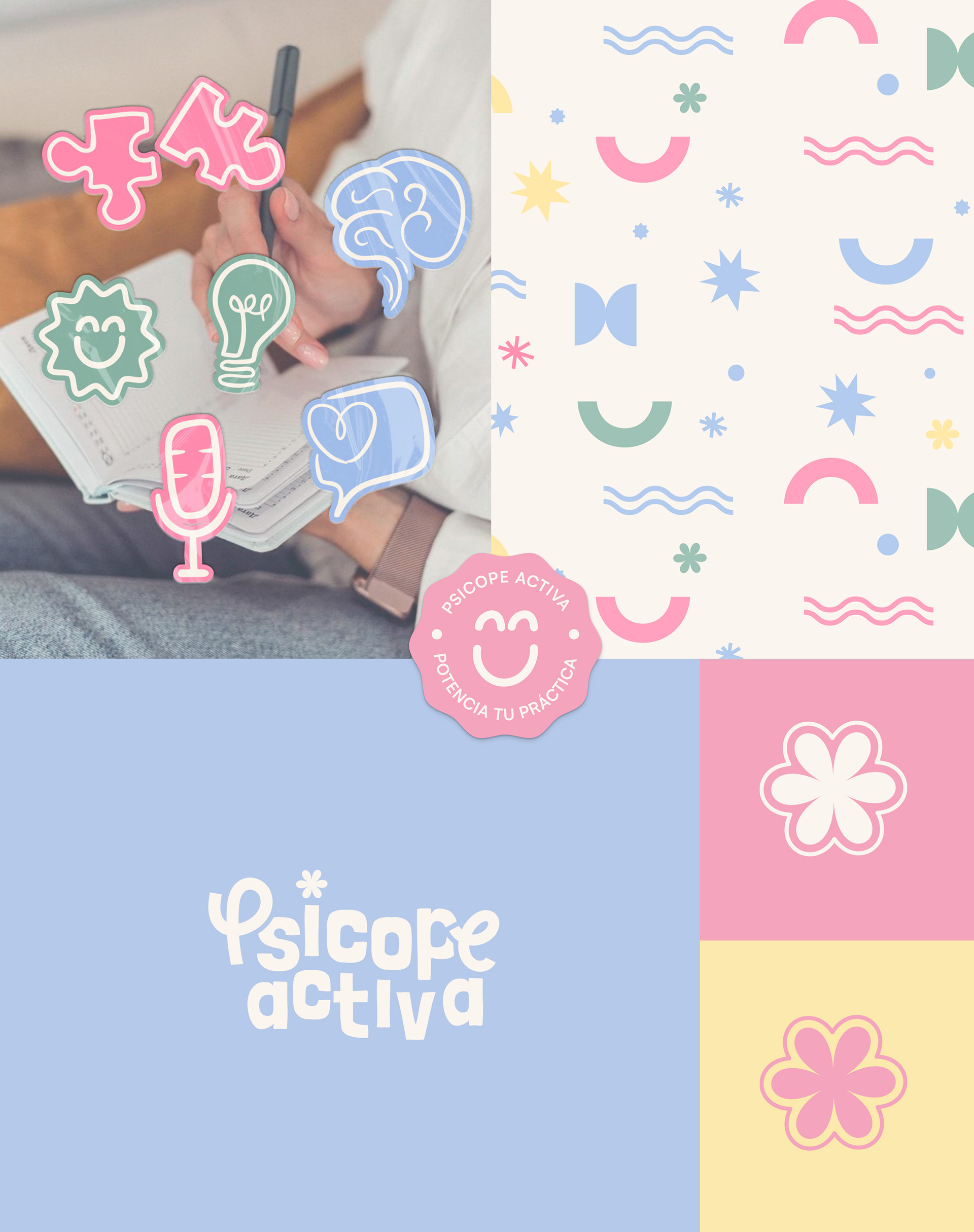 La identidad visual de fue diseñada para reflejar una práctica psicopedagógica cercana, dinámica y humana. A través de una paleta de colores suaves y armoniosos se buscó transmitir calma, empatía y confianza, mientras que las formas curvas y los elementos gráficos orgánicos representan los procesos de aprendizaje, acompañamiento y evolución.