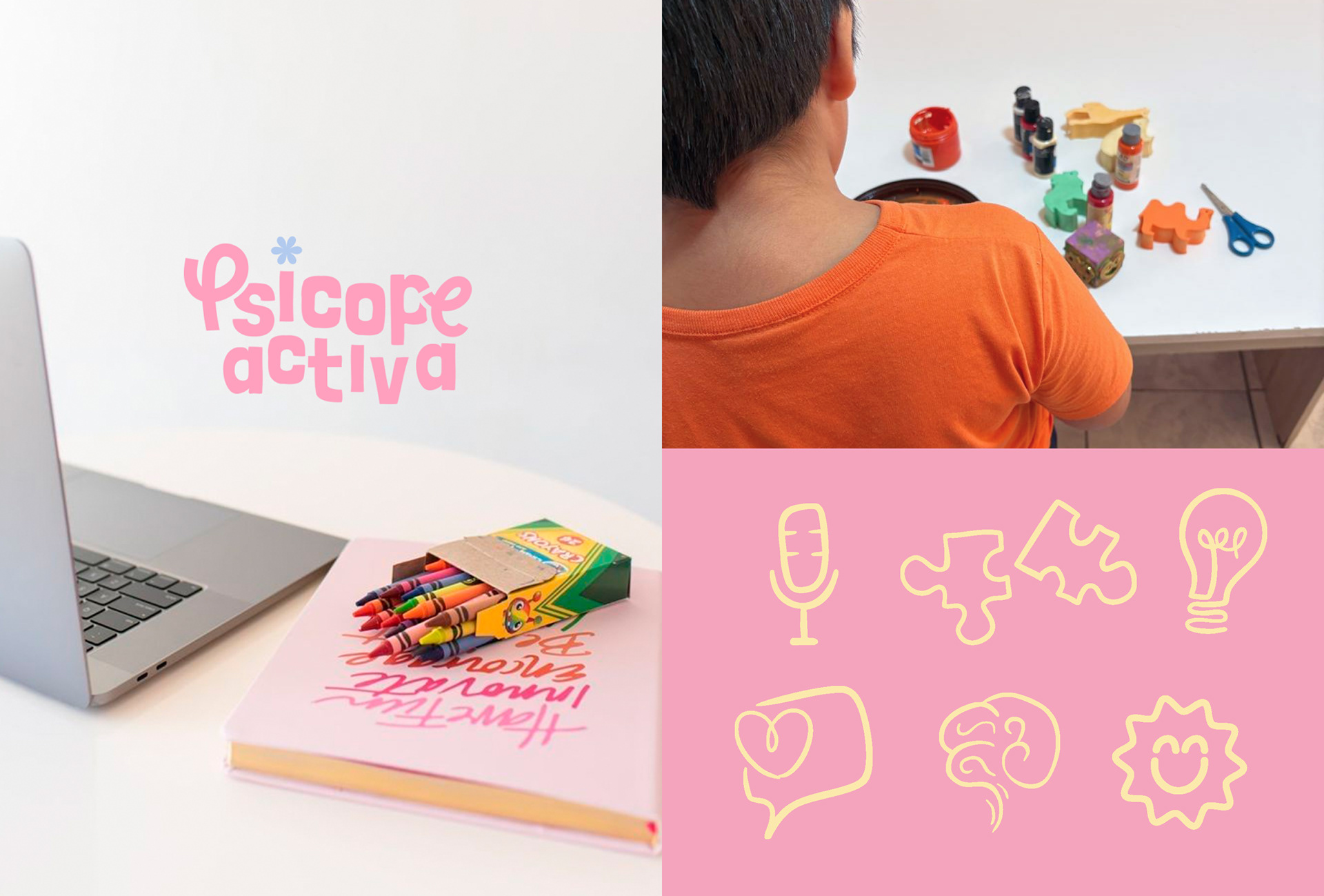El sistema visual incorpora íconos y patrones lúdicos que simbolizan ideas, comunicación, creatividad y desarrollo cognitivo, conectando con el trabajo cotidiano de la psicopedagogía. De esta manera, la marca logra equilibrar profesionalismo y calidez, construyendo una identidad accesible para docentes y psicopedagogas que buscan herramientas prácticas para potenciar su práctica profesional.